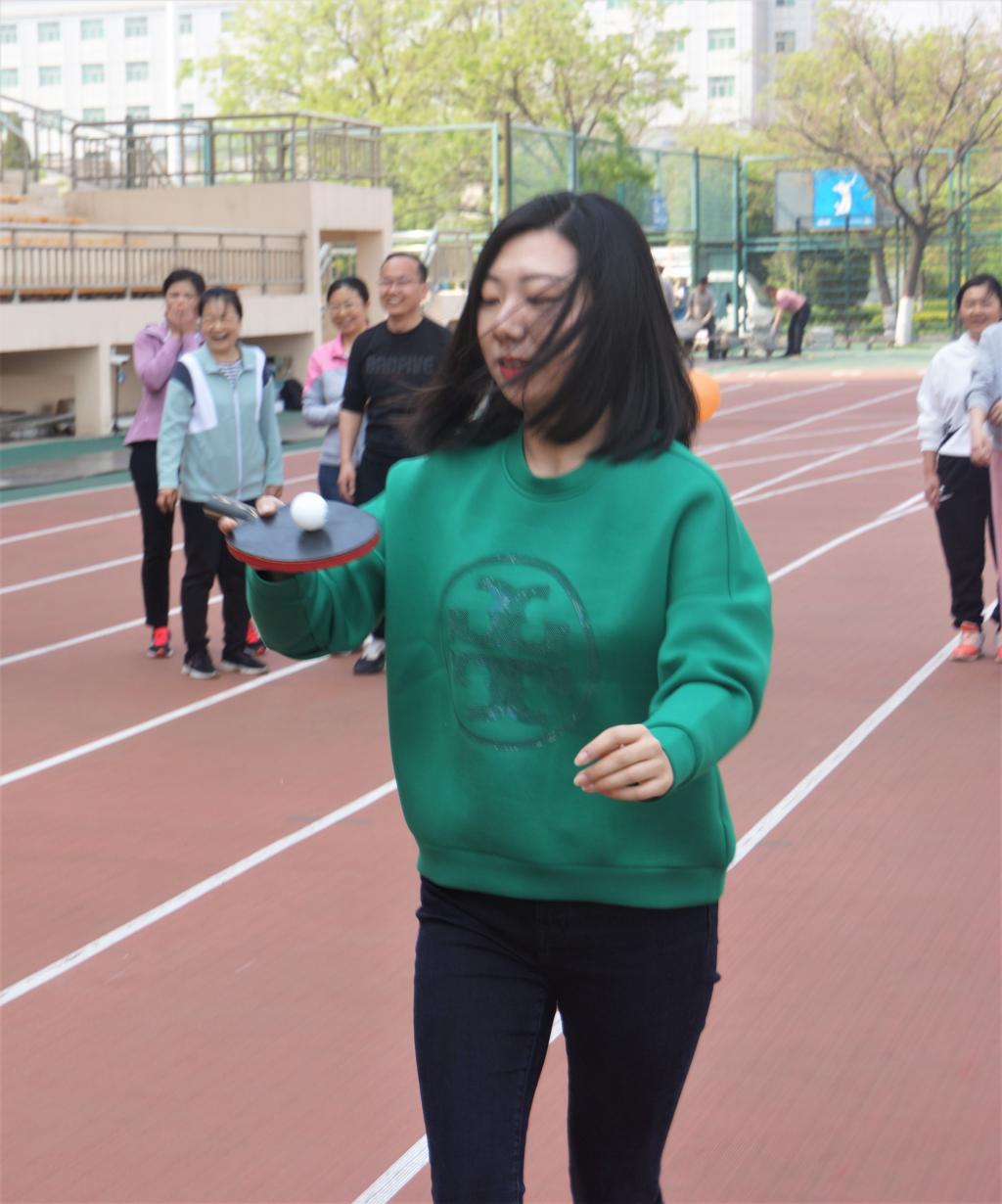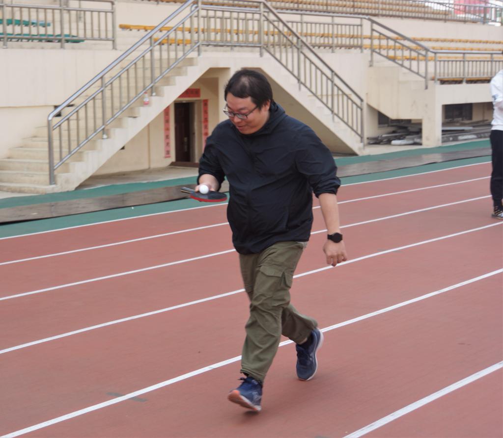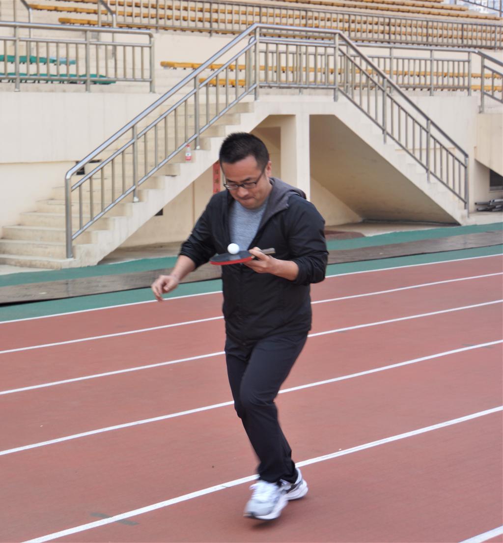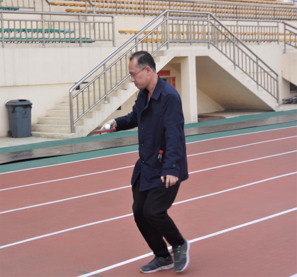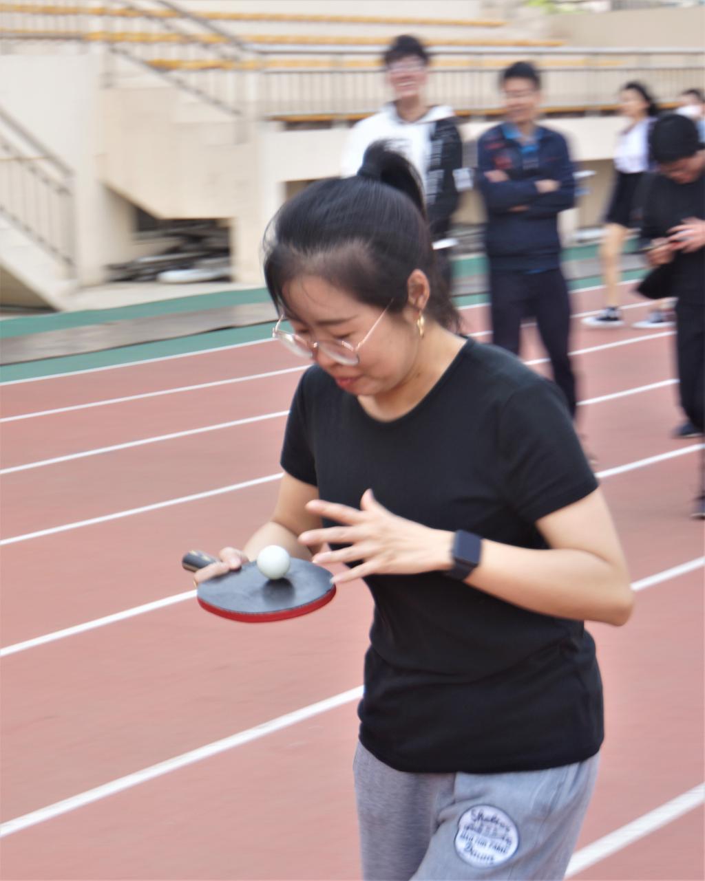 在分组之后,激动人心的趣味运动会正式开始了!运动会的第一项比赛是托球跑(计时赛),各组队员分为两队,每队列6人,面对面站立,比赛开始后,由其中一方将乒乓球放在球拍上,可跑可走,完成20米的比赛,然后将球交到队友手中,接力完成本轮比赛。两队同时比赛,分两轮完成全部比赛。