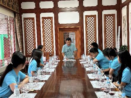 7月9日下午工作人员带领服务团队员来到品酒室完成调查问卷,耐心教队员们有关品酒的注意事项,和服务团一起分享自己的品酒体验,分享自己的生活趣事,极大程度上调动了服务团队员的积极性。随后,服务团队员就前一天校企座谈会上技术人员提出的在市场调查方面的相关问题进行了积极的讨论、展示,收获了现场人员的一致好评,丰富了团队成队员的实地调查经验。