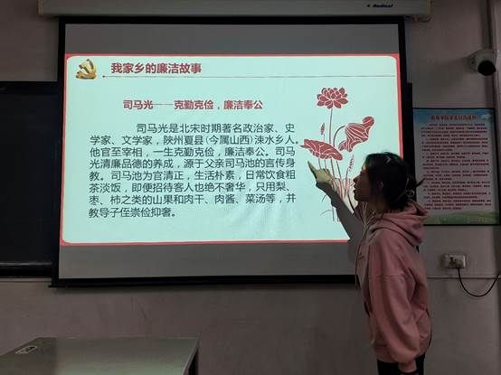 随后,同学们交流了家乡的廉洁故事。通过同学们积极讨论并展示演讲,学习了司马光,于成龙等人的清廉事迹。司马光是北宋时期著名政治家、史学家、文学家,陝州夏县(今属山西)涑水乡人。他官至宰相,一生克勤克俭,廉洁奉公。司马光清廉品德的养成,源于父亲司马池的言传身教。司马池为官清正,生活朴素,日常饮食粗茶淡饭,即便招待客人也绝不奢华,只用梨、枣、柿之类的山果和肉干、肉酱、菜汤等,并教导子侄崇俭抑奢。 于成龙,字北溟,号于山,清代山西永宁州(今山西省吕梁市方山县)人,被后世誉为“一代廉吏”。于成龙在20余年的宦海生涯中,三次被举“卓异”,以卓著的政绩和廉洁刻苦的一生,深得百姓爱戴,被康熙帝赞誉。在罗城六年,他布衣草鞋,把自己完全融入当地民众之中。临别罗城,出现了百姓追送数十里,哭而还的感人情景。他舍死忘生,为百姓日夜操劳,乡间问贫、田间耕作、深入匪巢、缉捉盗贼、平反冤案、救助孤儿。交流环节,同学们的积极发言,讲述家乡廉洁故事,学习家乡名人廉洁事迹。