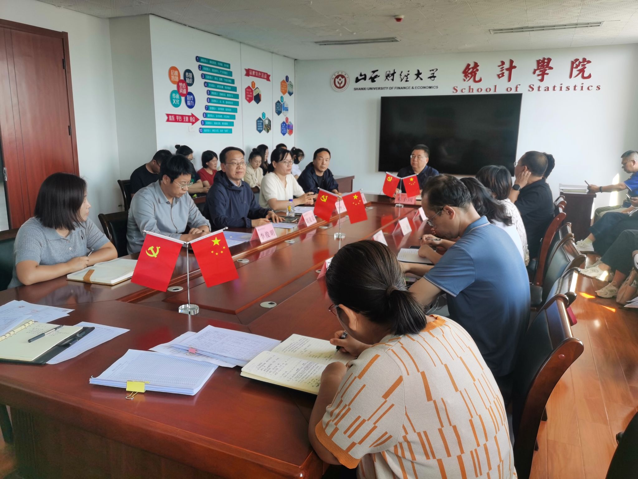 党委书记张锐主持并讲话,经济统计学系支部书记刘凌晨教授、统计学系支部书记李俊明教授交流心得体会,全体教职工参加学习。