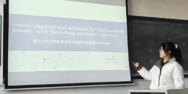 1月20日上午10:30,专项培训迎来学生分享环节。李星蕾同学以“基于多阶段随机算法的浅层神经网络退火特征选择”为主题展开演讲,结合PPT深入浅出地讲解了线性回归、逻辑回归的数学模型、正则化方法、前馈神经网络原理及特征选择核心算法。她还分享了高维数据处理中的过拟合问题解决方案与实验验证结果,为同学们带来了兼具深度与实用性的专业视角。